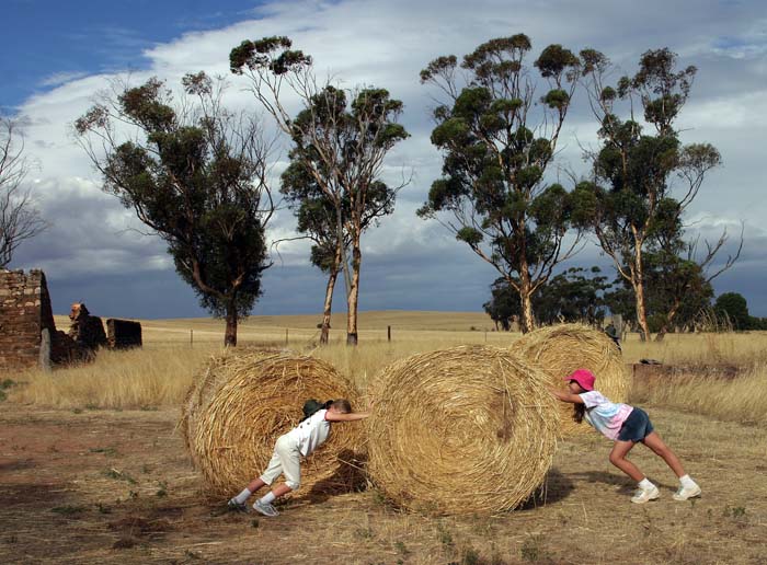 We had been planning to go up to Jamestown on Saturday with Anj, Pete, Katarina and Zof, to their family farm, but ended up waiting until Sunday, and slightly lower temps. Sunday morning we met Anj, Pete, Katarina and Zof at their house, swapped girls, and then headed north. We had a good trip, stopping in Clare on the way for coffee and ice cream, then continued on, arriving at Loudoun Brae, their family farm, in early afternoon. The girls immediately wanted to head off and explore, but since it was hot, and the tall grass made for increased snake danger, they stayed near the house, and built cubby houses (essentially Aboriginal-style humpies) against a big pine tree - Lucy and Zof used pine needles as their primary roofing material, while Katarina and Clara used straw. We had lunch in the much-cooler farmhouse, and looked through some old photo albums and learned about the history of the family and the place (it turns out that Banjo Paterson was a great grand uncle of Katarina and Zof!) After the outside weather had cooled off a bit, we went for a wander, first down to the old Loudoun Brae schoolhouse, where we picked a few ripe apples off the tree outside the door, and then back to the haybarn, where the girls had a good time climbing on the stacked round haybales, or having "pushes of war" trying to roll the bales one way or the other. Then we toured the old shearing shed, before making our way back to the farmhouse, and up to the top of the hill, where we had marvelous views (and noted the remnants of the golf course with black-tar greens - this was added to the farm when it became popular to have add some sporting/leisure activities on the farm.)
