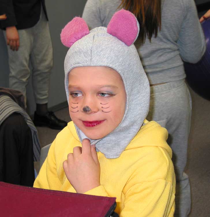 Saturday, Sandy and Clara went to Wilderness first thing in the morning for the first full dress rehearsal (make up and all!) of two plays Clara will be in. One play is called Belling the Cat; Clara's part is that of a not-too-smart mouse (which didn't set well with her at first!) The cast of this play were all girls in years 3 and 4. The other play is The Pied Piper in which Clara and the other girls turn into rats and finally into village children. Both plays included several really fun musical and dance numbers. Sandy volunteered to help out with the rehearsals, so in addition to helping Saturday, she'll be helping on Monday, and then on Tuesday for the actual performances. Meanwhile, Tim and Lucy went to the library, and then back home to work on robots and art - Here is the artist at work in "mixed media" - crayons, colored pencils, and markers.