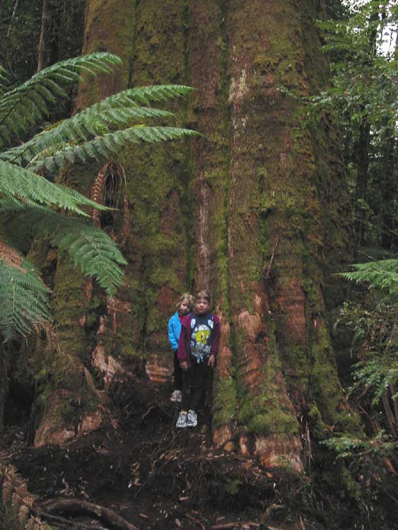 Although it was getting late, we decided to continue on with our planned trip through the Styx River valley, aka the Valley of the Giants, home of the tallest hardwood trees in the world. This is one of the last untouched areas of old growth Eucalyptus Regnans forest in the world. It is home to many trees in excess of 90 meters tall. We walked in to see the tallest tree (here's the top, and here's the bottom - couldn't get it all in one shot), and enjoy the wonderful rainforest climate, with tree ferns, moss, and fungi everywhere. Even though the sun was going down, we stopped for a few minutes for Tim to try his luck in the Styx River, and for the girls to explore animal tracks and look for bugs and frogs.