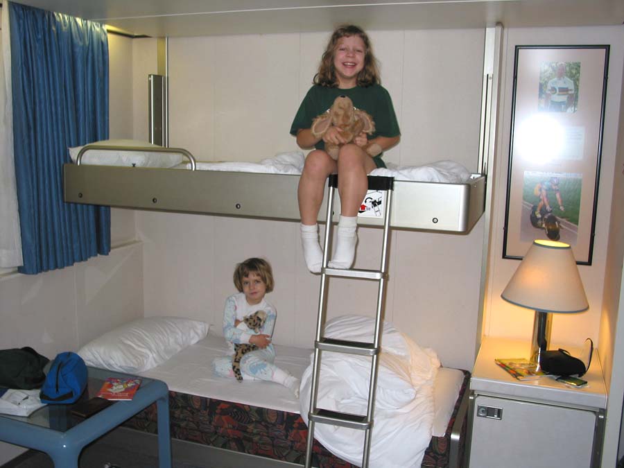 The current Spirit of Tasmania takes 14 hours for the crossing, and travels only at night, which means you can only travel every other day to Tasmania. (The current ferry is scheduled to be replaced by a pair of faster, even larger ships in September, which will allow traveling each way every day). They have a variety of accomodations, ranging from airplane-style seats (the advantage over planes is that you have the run of the ship, and they have a piano bar, game room, and other attractions) to suites with a bunkbed and a queen-size bed. We were in one of the suites, and Clara and Lucy thought it was all a great adventure, as can be seen here. (On the return trip, Tim wished we had gotten one of the four bunk rooms instead, as the greater rolling of the ship made it harder to stay in position - and thus to sleep - in the queen bed.)