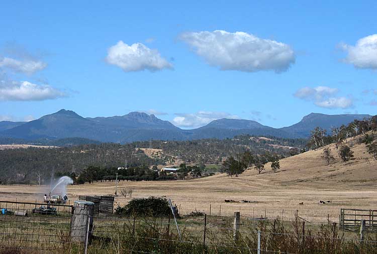 Sunday dawned bright and sunny, with no clouds - and although we had intended to slow down once we reached Hawley, and actually relax - we decided our weather luck couldn't hold much longer, and Tim really wanted to see Cradle Mountain - so we headed off. We passed through Sheffield, The Town of Murals (similar to other towns with a declining livelihood, they cast around in the 1980s for a theme to drive tourism - and came up with Murals - now there are scores of murals on the sides of town buildings, and they have become quite a tourist destination.) Near Sheffield, we passed Mt. Roland, a rocky monolith that stands mostly alone.